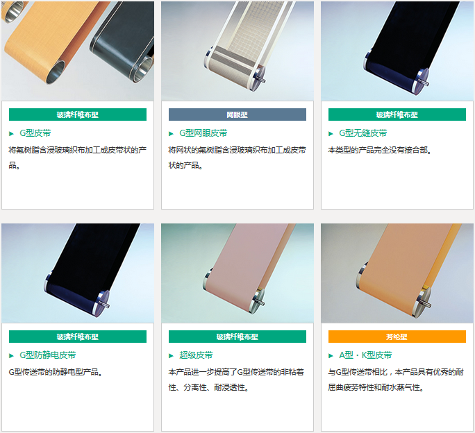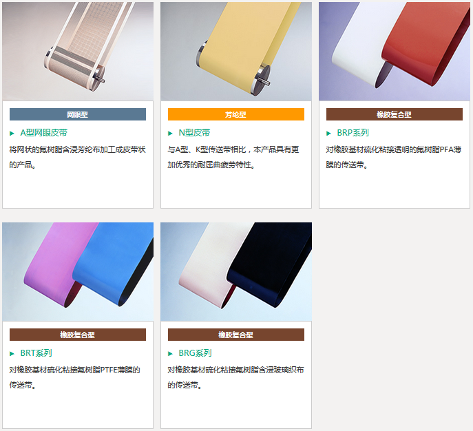 在各種工業(yè)用織布等上涂布氟樹脂涂層,加工成皮帶狀的輕量搬運用皮帶。 不僅在搬運工序中,在產品加工等工序中也發(fā)揮了各種作用。
